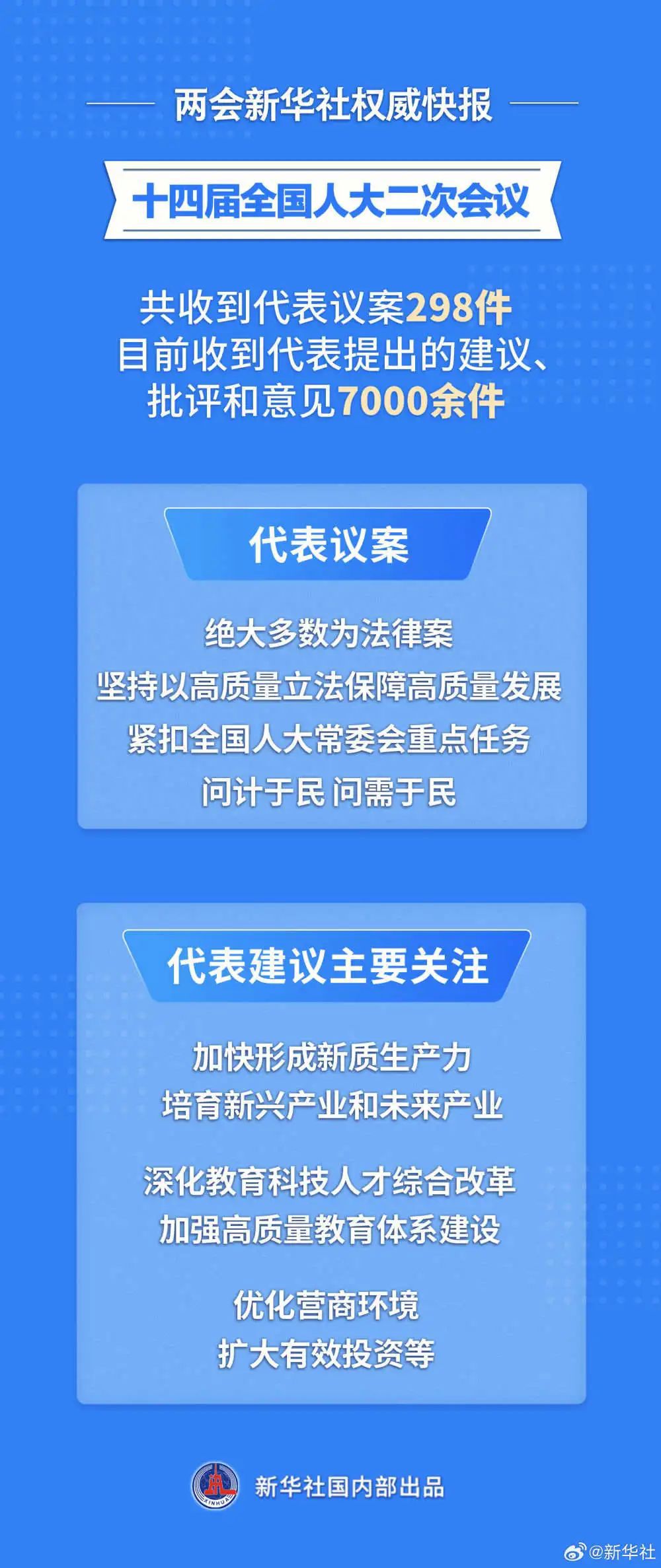 根据大会主席团决定的代表提出议案的截止时间,到3月8日12时,十四届全国人大二次会议秘书处共收到代表提出的议案298件。此外,目前大会秘书处收到代表提出的建议、批评和意见7000余件。