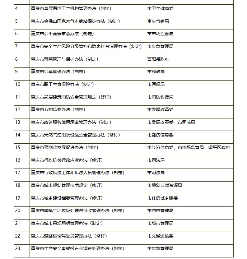 根据国家和我市相关要求开展的地方性法规、政府规章的清理工作,由相关责任单位按照《重庆市政府规章管理办法》等有关规定执行。